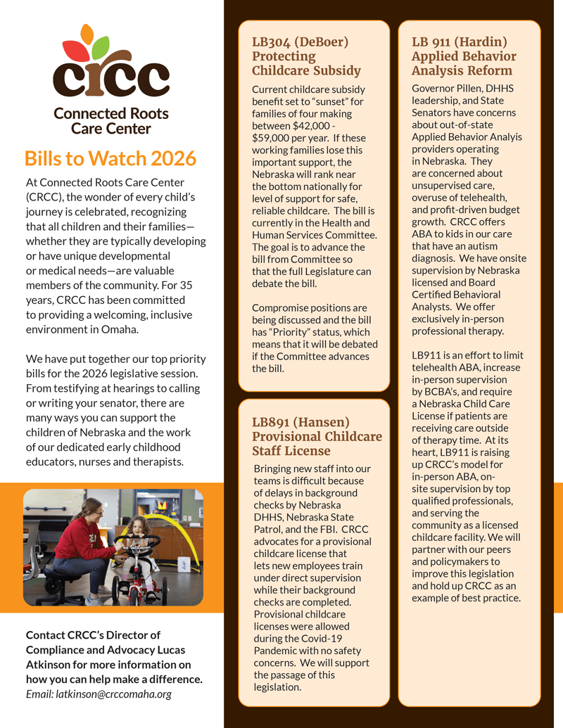This year's legislative session is a "short session" lasting just 60 working days. The biggest issue before elected legislators is closing a $471 million budget deficit to maintain Nebraska's requirement for a balanced budget and fully funded rainy-day fund. In tough budget years like this there is usually a focus on social issues and defending against cuts to programs and public funding. Successful new initiatives will be at no cost or low cost. CRCC will advocate against potential cuts to Health and Human Services programs and services that benefit families we serve.